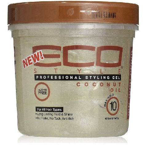 Eco Style: Coconut oil Gel 16oz is made with 100% pure coconut oil. Coconut Oil helps your scalp naturally regulate its own moisturizing system. Coconut oil helps attract moisture to the scalp and holds in it. Like all our styling gels, it is weightless and will leave your hair with a healthy shine and superior hold.