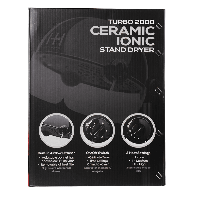This high-performance standing hood hair dryer features ceramic ionic technology with 3 temperature settings, 60 minute timer, adjustable height extension, built-in adjustable airflow diffuser, robust spin lock, and 120V. Ceramic Ionic Function insures even, smooth drying and a high performance motor ensures a long lifetime of heavy use!