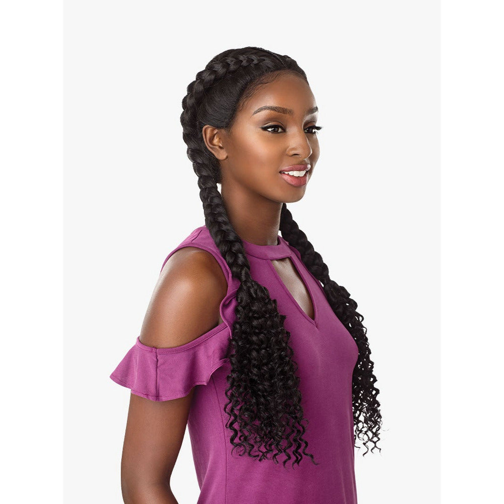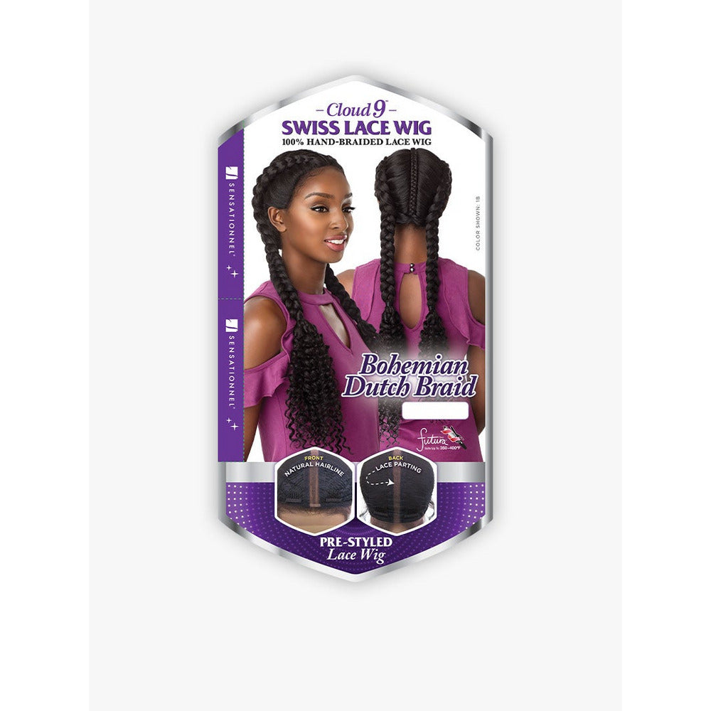 Sensationnel Cloud 9 Synthetic Pre-Styled Swiss Lace Wig - Bohemian Dutch Braid has a braided top and bohemian curls at the ends, which looks like it was hand-braided using the Bohemian curls, and has a vertical hand-knotted parting all the way to nape area.